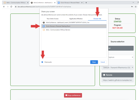· Selezionate la pagina web in cui è in corso la videoconferenza, selezionate il pulsante Share audio e fate clic su Share.