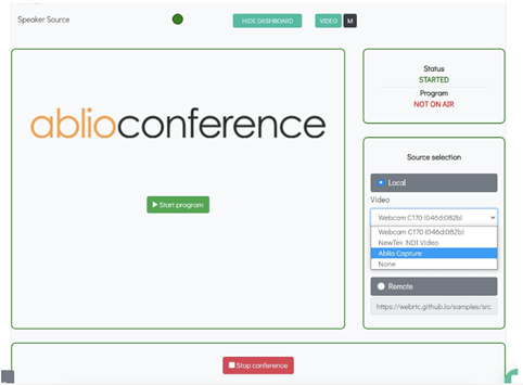 · Nel riquadro Video del riquadro di selezione della sorgente (Source selection), selezionate il dispositivo virtuale Ablio Capture e fate clic su Start program.