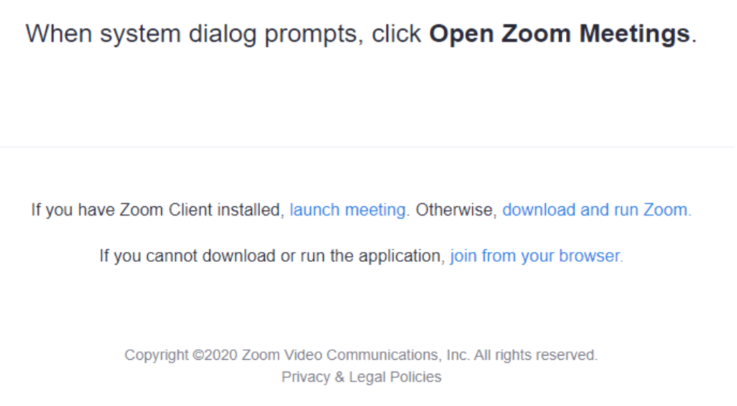 By default, most video conferencing platforms request you to join through their own apps: instead, choose the option to connect through a web page. For example, when you try to join into a Zoom conference, you are prompted with the following message: