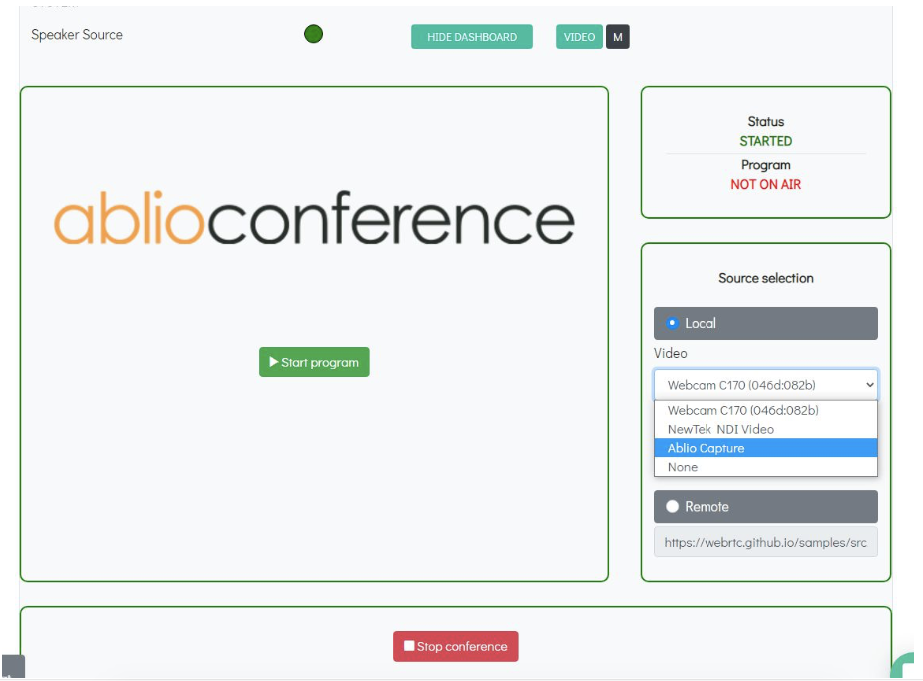 - In the Video box of the Source selection box, select the Ablio Capture virtual device and click Start Program