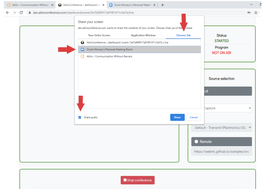 - select the web page where the video conference is running, thickle the Share audio button and click Share.
